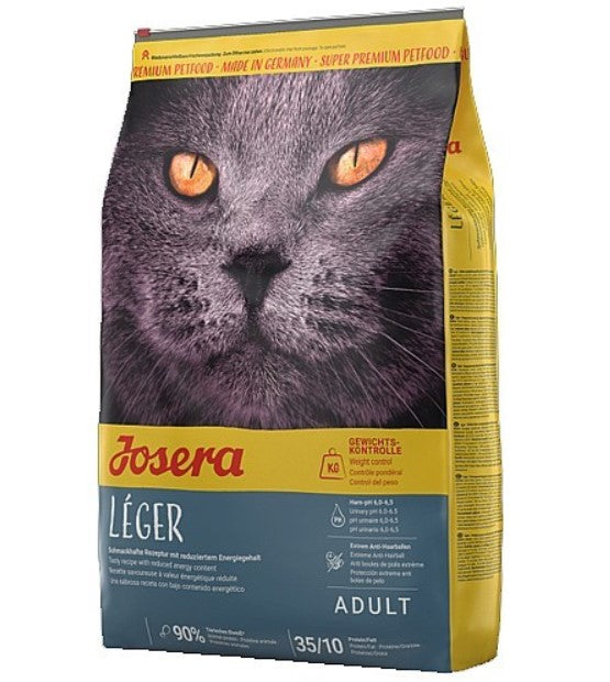 ג’וסרה לגר/ Josera Léger לייט מזון סופר פרימיום מופחת קלוריות,תוצרת גרמניה. לחתולים בוגרים בעלי נטייה להשמנה,מכיל סיבים תזונתיים להגברת תחושת השובע ולמניעת כדורי שיער. חומציות מאוזנת למניעת אבנים בדרכי השתן. השק במשקל 2 קילו ,מגיע עם רוכסן זיפלוק לשמירת טריות המזון.